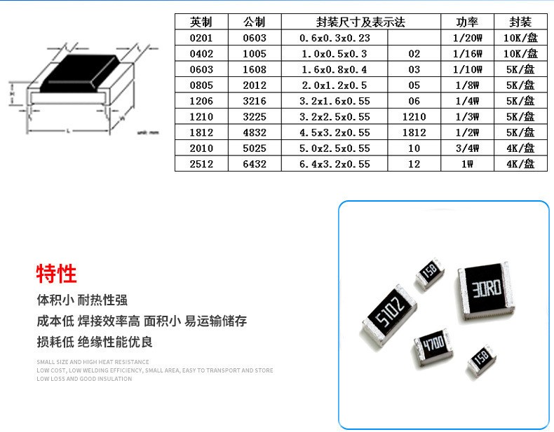 型號有0201 0402 0603 0805 1206 1210 1812 2010 2512