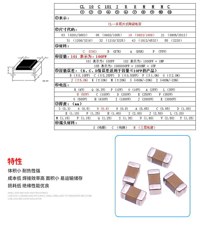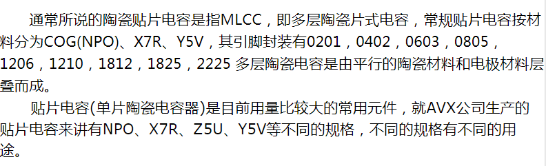 通常所說的陶瓷貼片電容是指MLCC,即多層陶瓷片式電容,常規貼片電容按材料分為COG(NPO)、X7R、Y5V,其引腳封裝有0201,0402,0603,0805,1206,1210,1812,1825,2225 多層陶瓷電容是由平行的陶瓷材料和電極材料層疊而成。